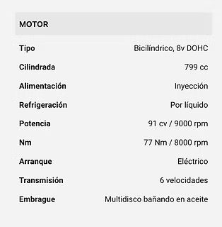 Motor Bicilíndrico 799 cc. Potencia 92 CV. Iluminación Full LED. Freno doble disco delantero. Dashboard con pantalla TFT 7″ Multifunción.